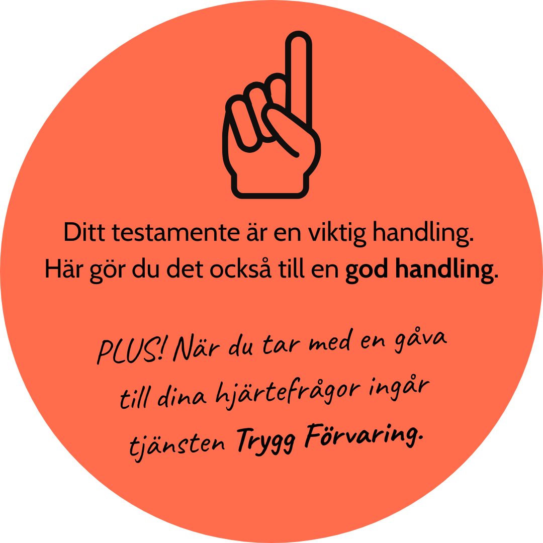 Till och med den 31 oktober kan du skriva testamente och ta med en gåva till din eller dina favoritorganisationer, och få tjänsten Trygg Förvaring utan kostnad när du gör det. Men vänta inte! Då kanske det inte blir gjort!